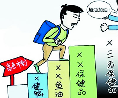 虚假宣传,是保健品市场存在的一个较为普遍的问题。从市消协、市工商局提供的投诉情况来看,绝大部分保健品类投诉均指向“虚假宣传”。商家利用消费者追求健康的心理,借机夸大保健品的功效。只不过,平时“受害者”多是老年人,而在中高考前夕又变成了学生而已。
