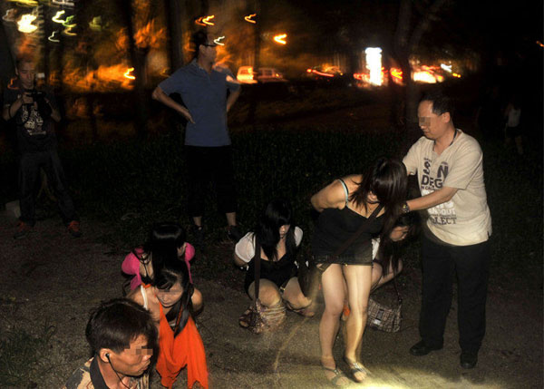 昨晚,佛山大道市中心血站段,警察在小树林里抓住一些正在“候客”的女子