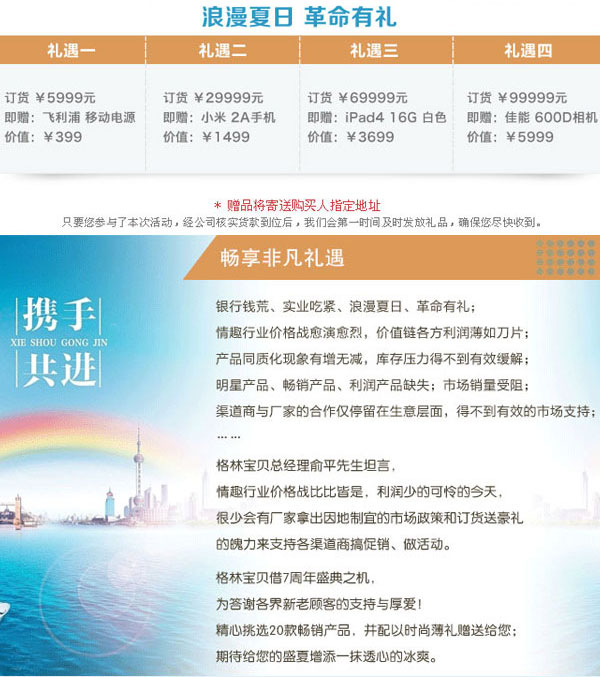 内容摘要:格林宝贝借7周年盛典之机,为答谢各界新老顾客的支持与厚爱!精心挑选20款畅销产品,并配以时尚薄礼赠送给您;期待给您的盛夏增添一抹透心的冰爽。活动时间为2013年7月1日至7月21日!