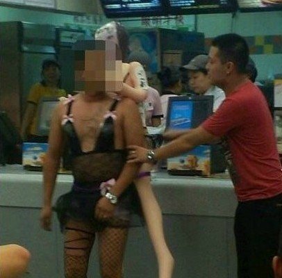 KFC泸州江城店自从食品中毒事件后,引起了众人关注, 8月5日晚上在该店身穿黑色蕾丝小短裙,背上背绑充气娃娃“奇葩男”这几天成为网络热点。