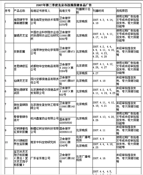 北京市药品监督管理局8月9日公布了2007年第二季度共对北京4家主要报纸类媒体发布的保健食品广告进行了监测,共监测到违规发布的保健食品广告100次,涉及17种保健食品。从广告发布情况上看,违规行为包括擅自篡改审批内容发布(4%)、未经审批擅自发布(84%)、使用过期广告批准文号(12%),北京市药品监督管理局将上海荣神生物化学有限公司的安泰胶囊在北京晚报上刊登违法广告的17家涉案企业和媒体移交北京市工商行政管理局核查处理。