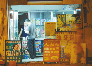 黎明路立交桥附近一家成人用品店,货架上摆放着一溜的赤裸人体外盒包装的各种春药,粉状、片状、水剂一应俱全。
