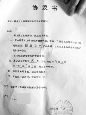 而在吕女士所签的协议书上,写着“乙方(吕女士)有义务协助甲方(健康卫士公司)宣传产品和宣传公司”。