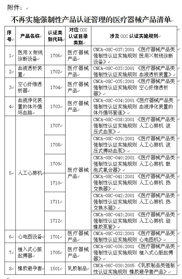 指定认证机构不再实施8种医疗器械产品的强制性产品认证,注销已出具的上述产品的强制性产品认证证书。