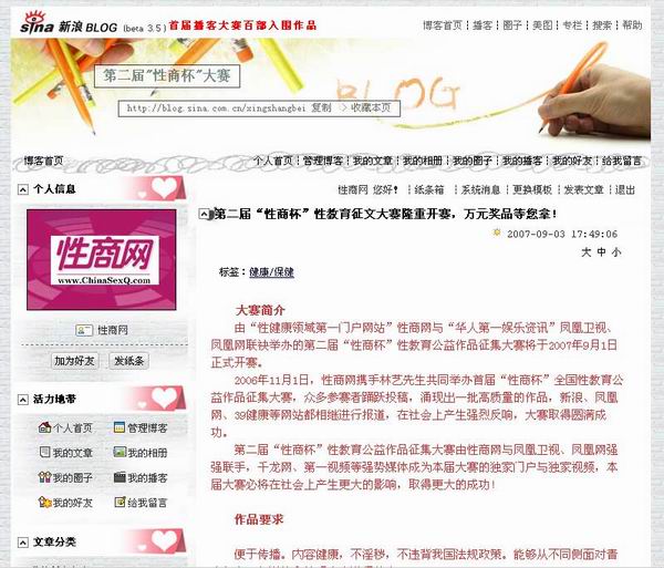 推广1:新浪博客开通大赛征文活动博客(2007年9月1日—2007年12月31日)