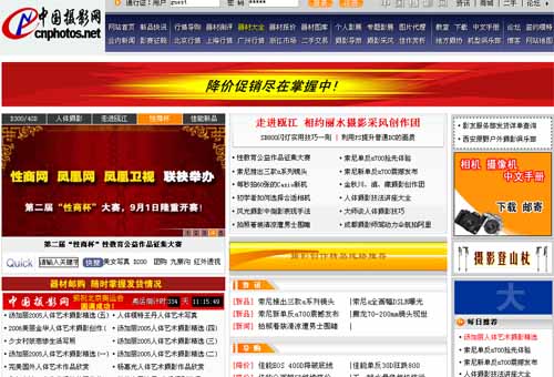 中国摄影网于2000年6月开通,致力于向摄影爱好者、专业摄影工作者及摄影行业用户提供全面而可靠的信息和服务。其中包括:网上购物、二手器材买卖、企业产品网上在线推广;提供尼康、佳能、美能达、索尼、富士、柯达、松下等全球知名摄影摄像器材的试用报告、器材点评、器材测评、外观展示、器材报价、中文使用说明书下载以及新产品的最新上市动态。以及摄影教室、个人影展、网上影展、摄影导游、图片代理、摄影论坛、组织外拍活动、 网上个人相册、摄影商城。