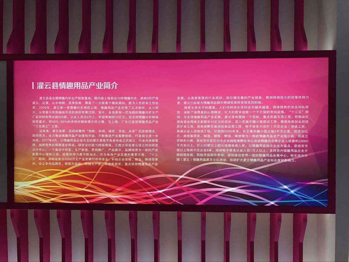 灌云县位于“一带一路”交汇点城市——江苏连云港市,有一定规模的情趣内衣及相关生产厂家和销售网店共500多家,年销售额超10亿元,在全国市场占比达50%—60%。
