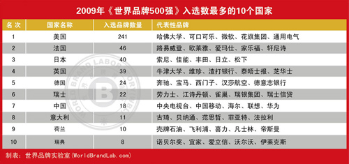 2009年世界品牌500强入选品牌最多的10个国家