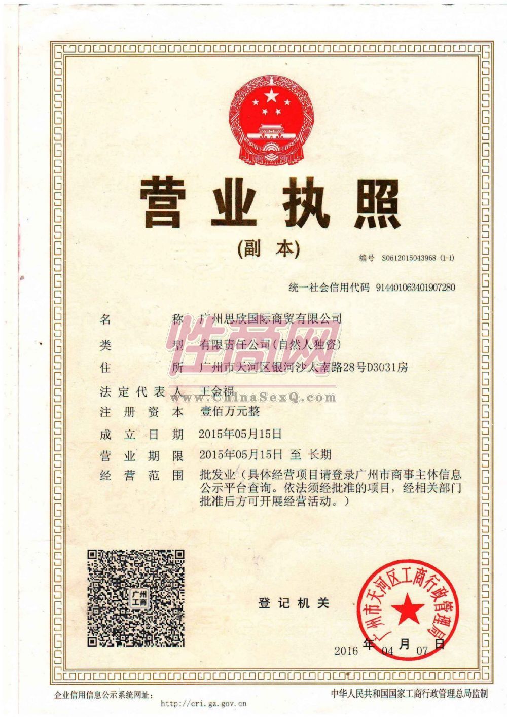 广州思欣国际商贸有限公司是以网络运营、微信运营为主的投资管理公司,公司总部设在美丽的羊城--广州,合作业务遍及全国各大城市,主要开展专业的成人用品(包括男性用品、女性用品、医疗设备、情趣用品性工具 、另类玩具 、仿真阴阳器 、延时助情、安全套润滑剂 、情趣内衣、卫裤 、润滑油喷剂)等业务。目前,公司在网络销售市场大力投入,与多家优质供应商合作,实现了良好的营收效益。公司不仅拥有雄厚的资本与良性增值能力,而且拥有先进的网络销售模式及管理理念。并自我设定一套成熟的网络运作模式。通过建立了系统和富有特色的管理体系,形成了一整套自有的现代化网络运营模式和电话销售战略团队。