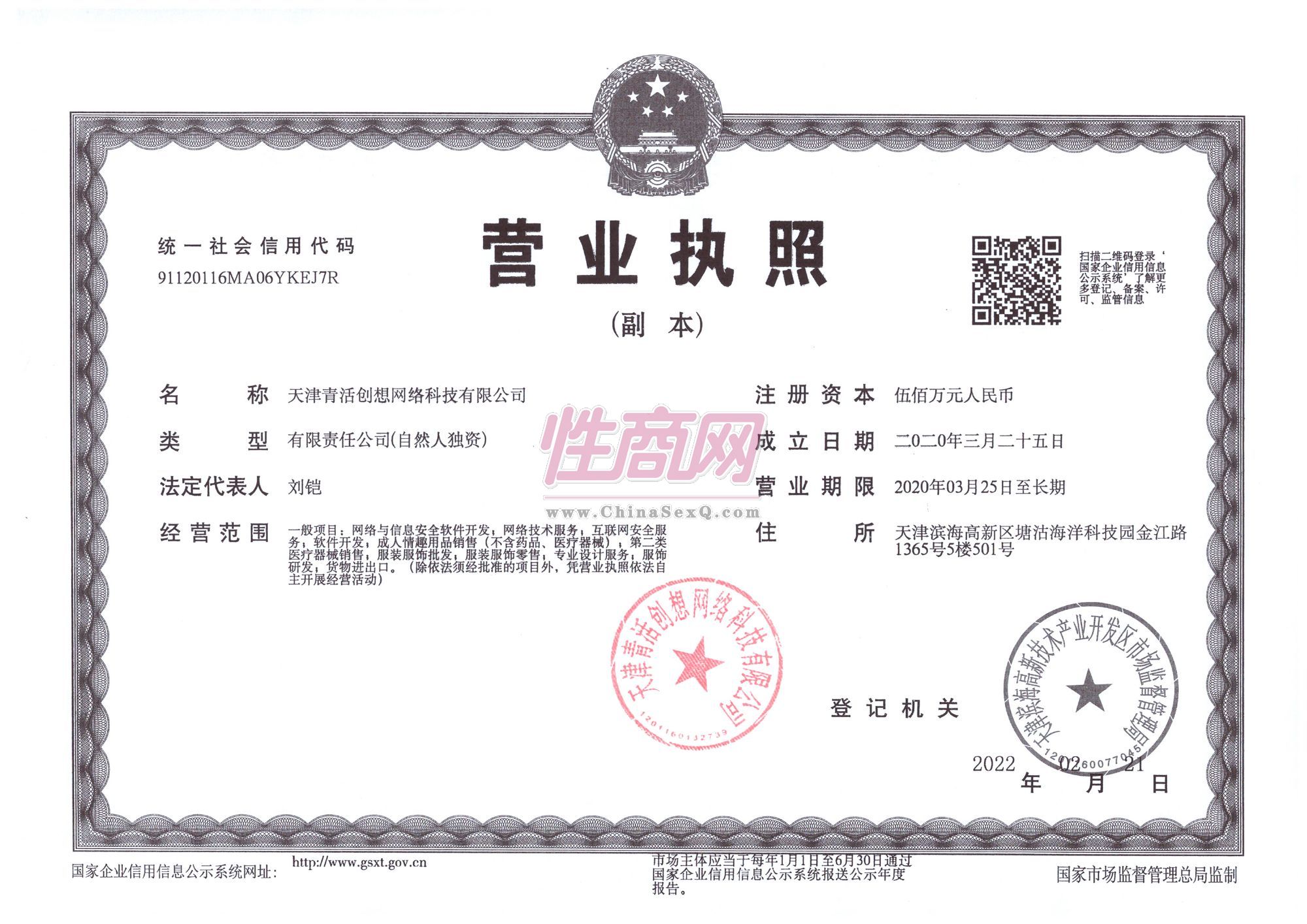 天津青活创想网络科技有限公司是一家专注于情趣用品的行业,集研发设计、生产、销售及服务于一体的企业。公司成立于2020年03月25日,主营食色杏也、古色古香等多个健康情趣系列产品,其目标打造引领情趣市场潮流的品牌。