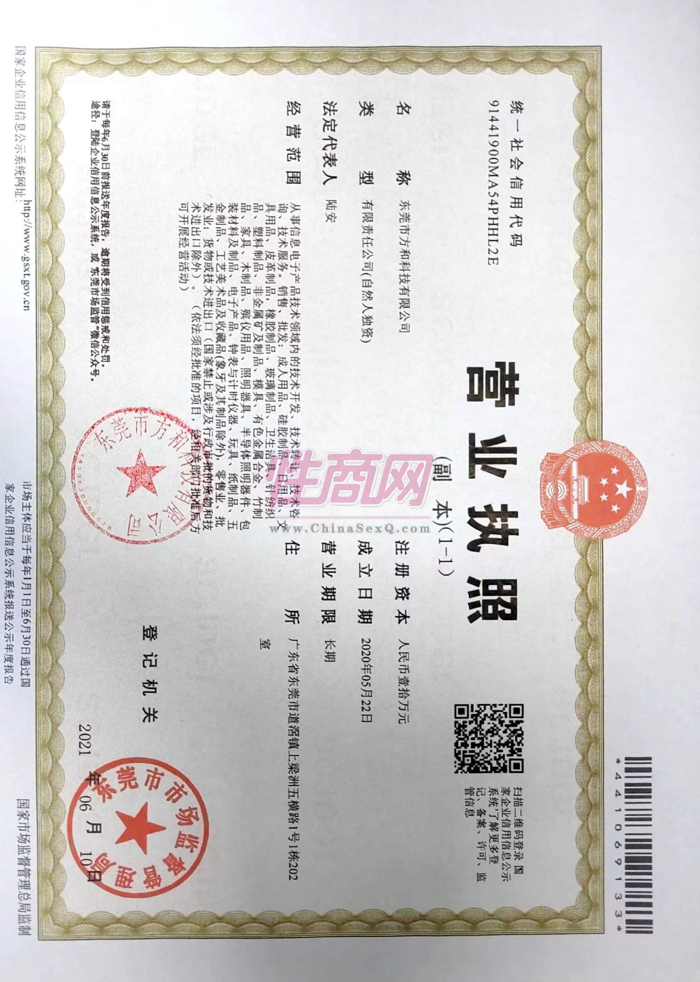 东莞市方和科技有了限公司于2020年5月22日成立,注册资本10万元,公司位于广东省东莞市道滘镇上梁洲五横路1号1栋2楼202室,主要生产经营 五金产品研发;五金产品制造;五金产品批发;橡胶制品制造;橡胶制品销售;成人情趣用品销售(不含药品、医疗器械);成人情趣用品制造(不含药品、医 疗器械);塑料制品制造;塑料制品销售;日用品销售; 模具制造;模具销售;非金属矿及制品销售;半导体照明 器件制造;半导体照明器件销售;电子产品销售;玩具制造;玩具销售;纸制品制造;纸制品销售;有色金属合金 制造;有色金属合金销售;工艺美术品及收藏品零售(象牙及其制品除外);包装材料及制品销售;家具制造;家具销售;家具安装和维修服务;货物进出口;技术进出口,
