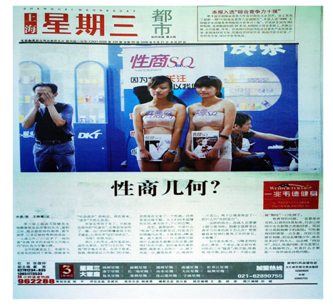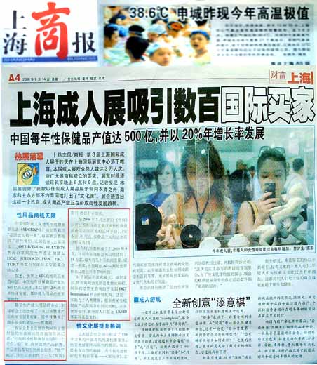 继性商网登上《上海商报》头版后,今天,性商网又登上了《上海星期三》的整版,《上海星期三》是一份都市类报刊,刚刚入选了“2006全国城市生活服务类周报综合竞争力十强”,在上海具有巨大的影响力