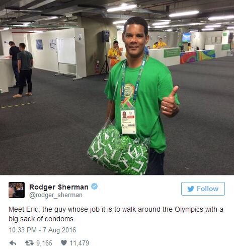 编者按:本届里约奥运会正在火热的进行着,引人关注的不仅仅只是运动员们,还有一位默默无闻的巴西英雄埃里克,媒体报道称主办方为运动员们发放了共计450,000个避孕套和175,000支润滑剂。毫无疑问,赛场外运动员们的生活也同样丰富。数量如此充足的避孕套可以让他们尽情释放自我,一天至少2至3次。那么埃里克的任务是要把45万避孕套分给馆场内的运动员和工作人员们,小编真要为这位巴西英雄点个赞啦,默默无闻的奉献啊。
